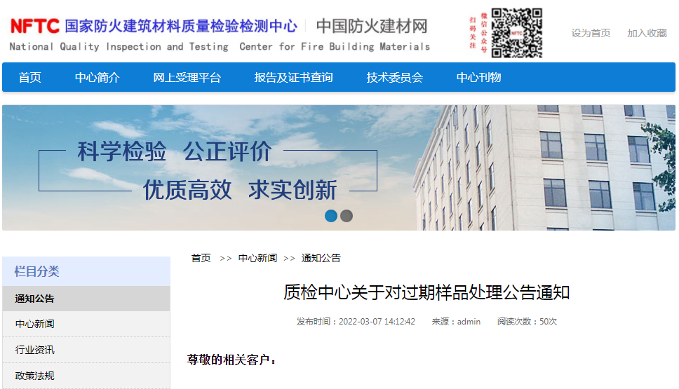 貴公司送到國家防火建筑材料質(zhì)量檢驗(yàn)檢測(cè)中心(以下簡稱質(zhì)檢中心)的待檢樣品已超過90天,未辦理完成檢驗(yàn)手續(xù),多次致電,貴公司仍未開展下一步工作。按照質(zhì)檢中心管理體系文件《程序文件、管理制度》(第六版)中ZCX7.4-1-2019《樣品管理程序》中5.6條的規(guī)定“送到中心的樣品,客戶應(yīng)在60日內(nèi)辦理相關(guān)檢驗(yàn)申請(qǐng),如送至中心后超過60日仍未辦理相關(guān)手續(xù),中心在網(wǎng)上公示,由技術(shù)科分類處置樣品”。